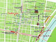 From ASAKUSA station on Tokyo Metro Ginza subway line & Toei Asakusa line- (13-min. walk): Take Exit No. 4a out of the subway station and walk right to the main street (you will see a police box and the large lantern of Kaminarimon Gate across the street). Walk left down this main street until you come to a T intersection (you will see an Family Mart convenience store across the street in front of you). Cross to the Family Mart side of the street and walk right until you see a 24-hour sushi shop called 'SUSHI-ICHIBAN' and another restaurant called 'Gyu-Kaku' above that (you will see 'Seray Kebab' on the opposite corner and 'Denny's' and the 'ROX' building across the street). Turn left at this corner (down the small street between the sushi restaurant and the kebab shop) and then make a right turn on the SECOND block (you will see a small shrine on the first block). You will find us on the left-hand side of the street with a blue & white signboard on the building and just next to a parking lot.